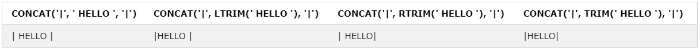 CONCAT('|', TRIM(' HELLO '), '|');