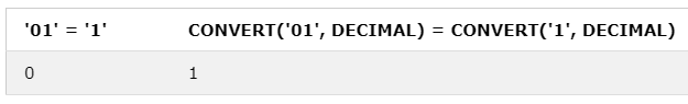 CONVERT('01', DECIMAL) = CONVERT('1', DECIMAL);