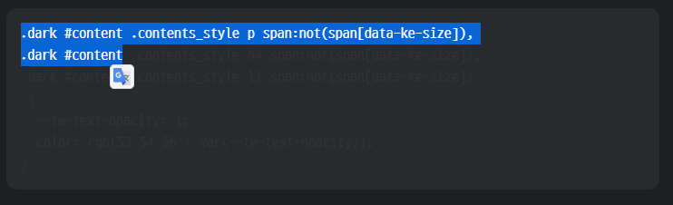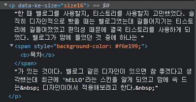 - 크롬 > 개발자 도구에서 확인한 결과, 글자색과 관련된 소스는 아래와 같다. 배경색이 적용된 부분은 span 태그를 사용하였고 background-color 속성을 가진 span 태그에 대해서만 글자색을 다르게 적용해주면 된다.