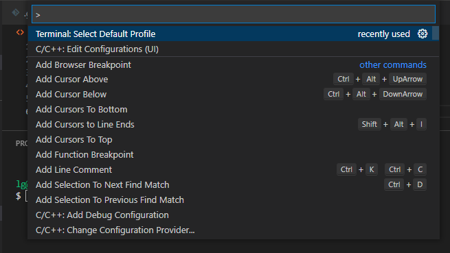 2. ํฐ๋ฏธ๋์์ ctrl + shift + p๋ฅผ ๋๋ฅด๋ฉด ์๋์ ๊ฐ์ ๊ฒ์์ฐฝ์ด ๋จ๊ณ ๊ฒ์์ฐฝ์ 'select default profile'์ ์ ๋ ฅ