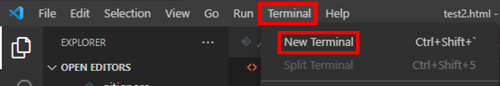 1. VS Code๋ฅผ ์คํ ํ, Terminal ํญ > New Terminal ํด๋ฆญ