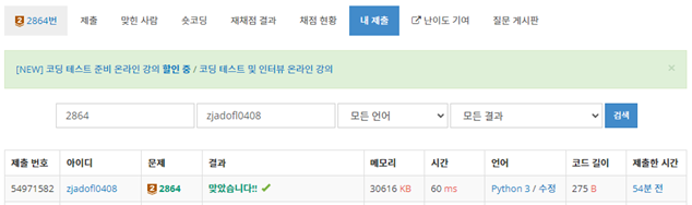 - 안되면 꼭 재설치하고 풀었던 문제의 '내 제출' 들어가기!