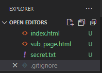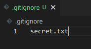 - 3개 파일 중 'secret.txt'라는 파일을 git이 신경쓰지 않게 지정하려고 한다. .gitignore 파일을 생성한다.
