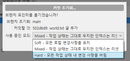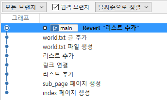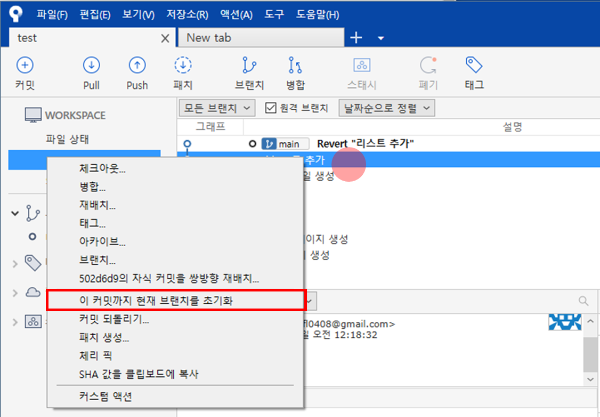 - 되돌릴 시점에 오른쪽 클릭 후, '이 커밋까지 현재 브릿지를 초기화'를 선택한다.