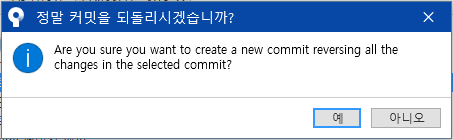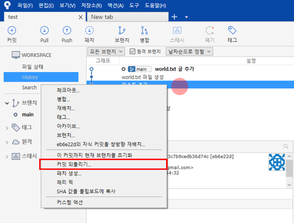 - 되돌릴 시점에 오른쪽 클릭 후, '커밋 되돌리기'를 클릭한다.